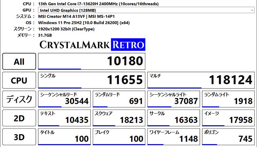 マシンパワーは事前に想定した条件を満たしているだけあり必要十分なレベルだと思います。参考までにCrystalMark Retroのベンチマークを載せておきます。