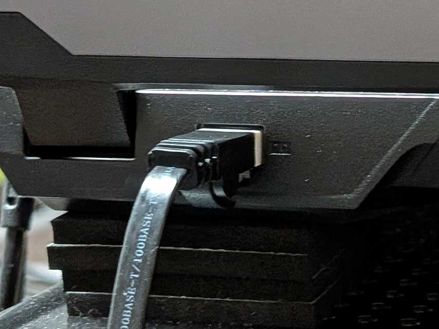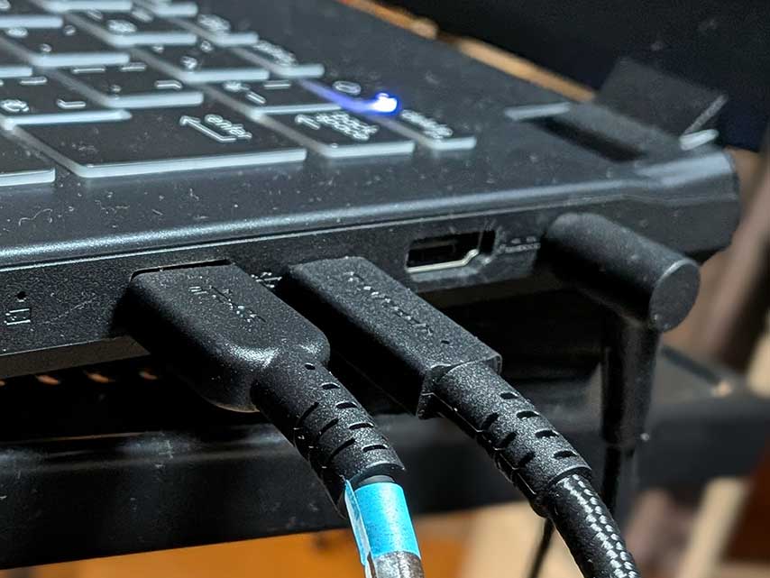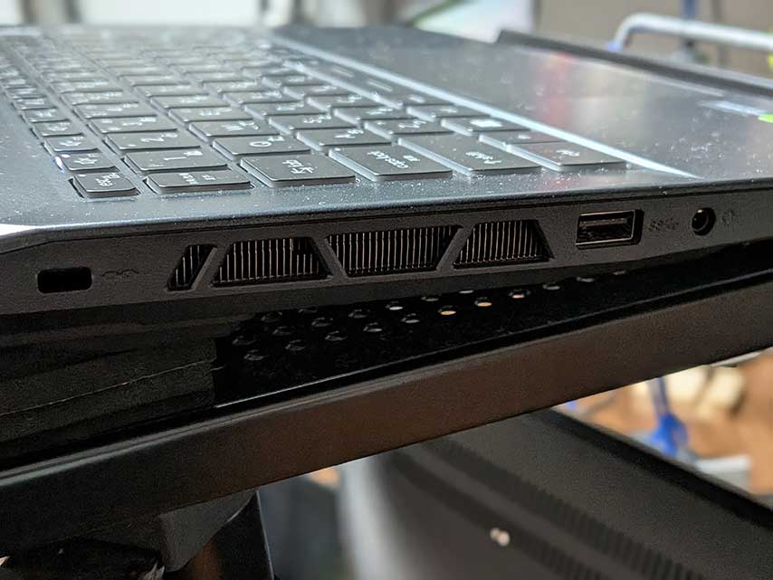 ゲーミングPCというかクリエイター向け?PCなのでもともと据え置きを想定しているのでしょう。外出先ではなく光回線を引いている各拠点で使う前提なので有線ポートが付いているのはありがたいです。その分だけ本体に厚みがある証拠ではあります。